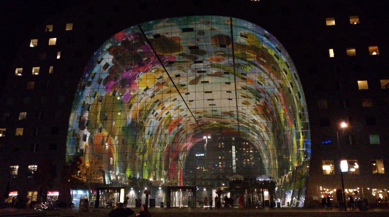 - Марктхаал. Напротив кубических домов вы увидите уникальное здание в форме гигантской подковы, внутри которой находится продовольственный рынок с невероятным разнообразием продуктов со всего света, а в самой подкове расположено более двухсот квартир. Арочный потолок декорирован красочными картинами фруктов, овощей и цветов, за что Марктхаал заслужил прозвище «голландской Сикстинской капеллы». Здесь же расположен большой супермаркет, подземный паркинг и рестораны и кафе с интернациональной кухней.